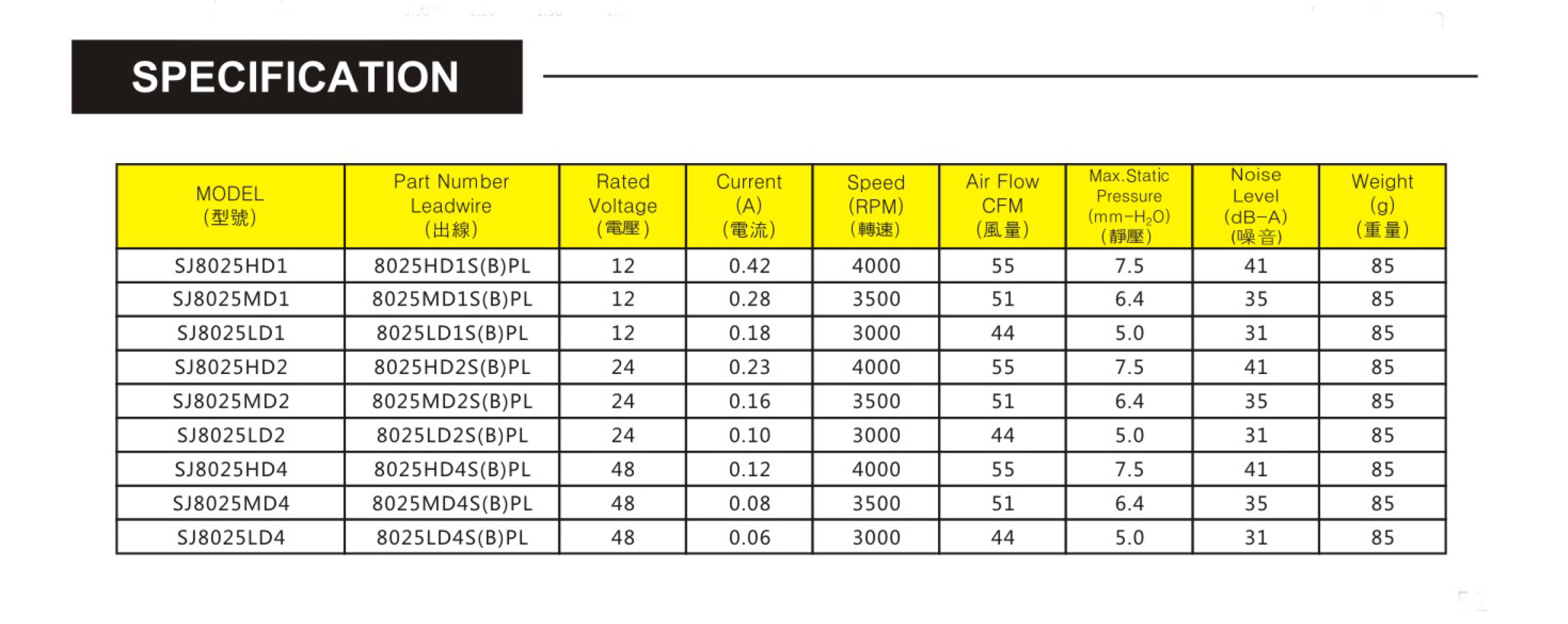 尺寸:80x80x25mm 框架: UL94V-0 PBT 軸承: 含油軸承& 雙滾珠軸承 電壓:DC 5V 12V 24V 48V 壽命:50 000Hours at 25℃--滾珠軸承 30 000Hours at 25℃--含油軸承 工作溫度:-20℃~70℃ 正常濕度 儲存溫度:-20℃~85℃ 正常濕度