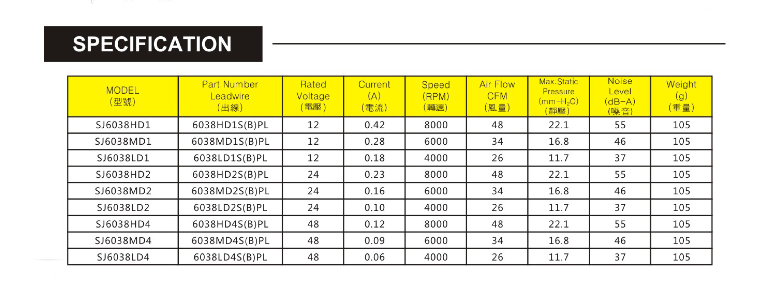 尺寸:60x60x38mm 框架: UL94V-0 PBT 軸承: 含油軸承& 雙滾珠軸承 電壓:DC 5V 12V 24V 48V 壽命:50 000Hours at 25℃--滾珠軸承 30 000Hours at 25℃--含油軸承 工作溫度:-20℃~70℃ 正常濕度 儲存溫度:-20℃~85℃ 正常濕度